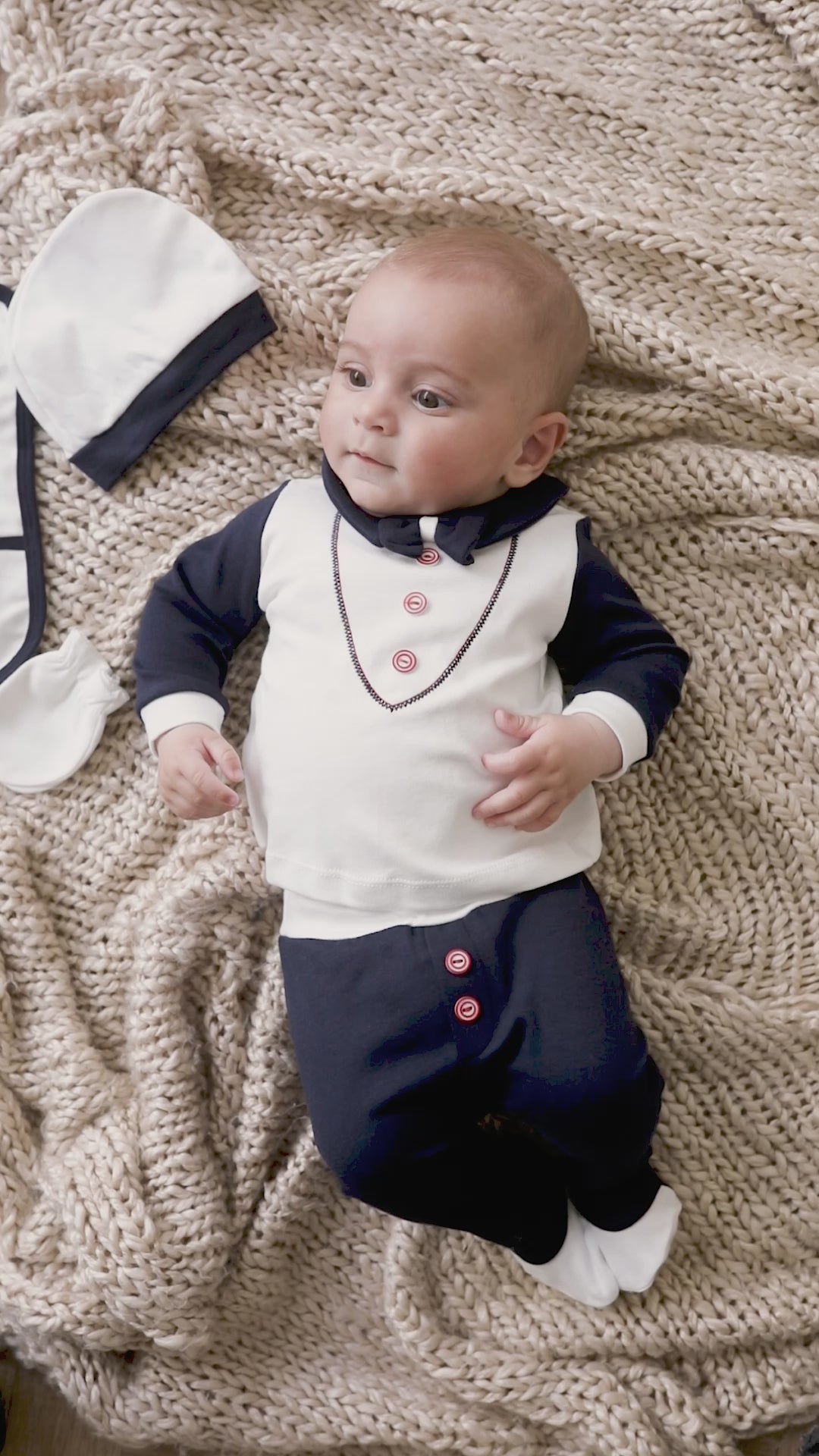 Description A 5-piece set with everything needed to keep your adorable peanut cute and cozy. Made from super soft cotton, the set comes with gloves for a scratch-free day, a charming bonnet, beguiling bib, and two-piece suit that’s easy to take on and off thanks to back buttons and a stretchy elastic waistband.