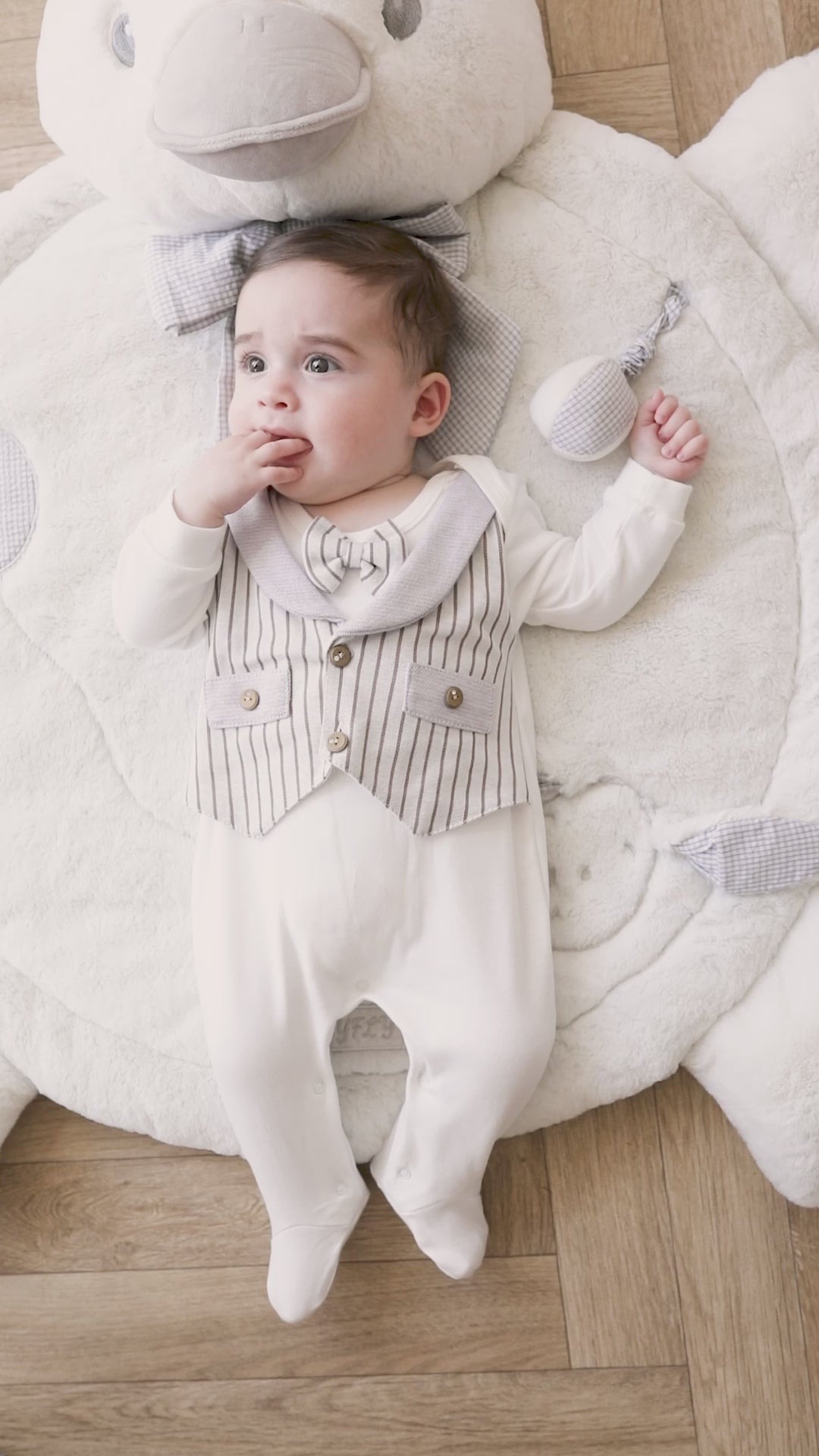 Description The perfect balance between old and new! Clothe your favorite fellow in this vintage-inspired onesie with a matching vest and bow tie. Wooden buttons adorned with a single, shimmering crystal elevate the look and make it easy to take on and off. While built-in footies keep him warm and cozy. The soft bow tie is the cherry on top, making him picture-perfect no matter the occasion.