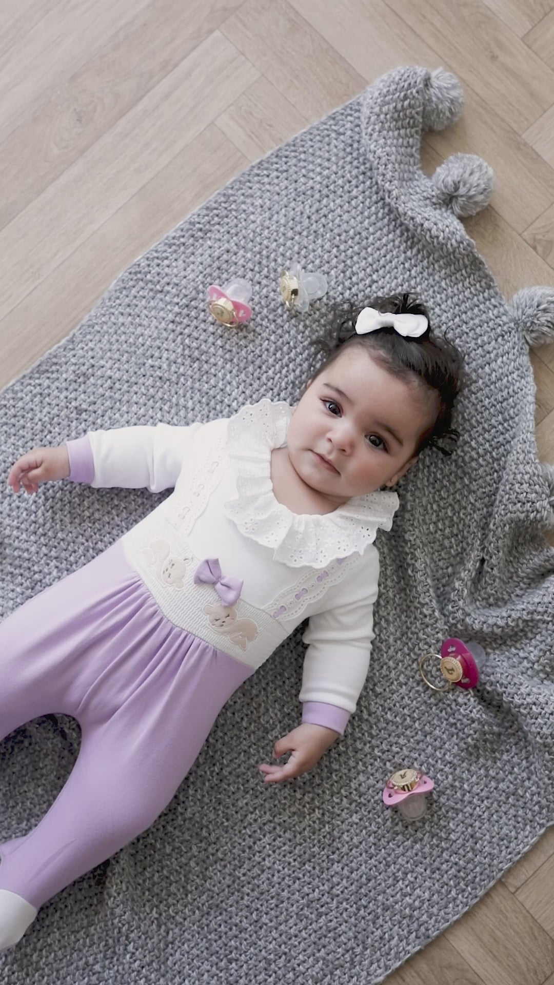 Dress your sunshine in the perfect combination of charm and comfort. This adorable onesie features an eyelet, ruffled collar for sweet elegance. Hand-embroidered, sleeping bears on the front to keep her company. And ruching along the waist to add a playful flair while ensuring a comfortable fit. Watch her shine with joy in this perfect fit.