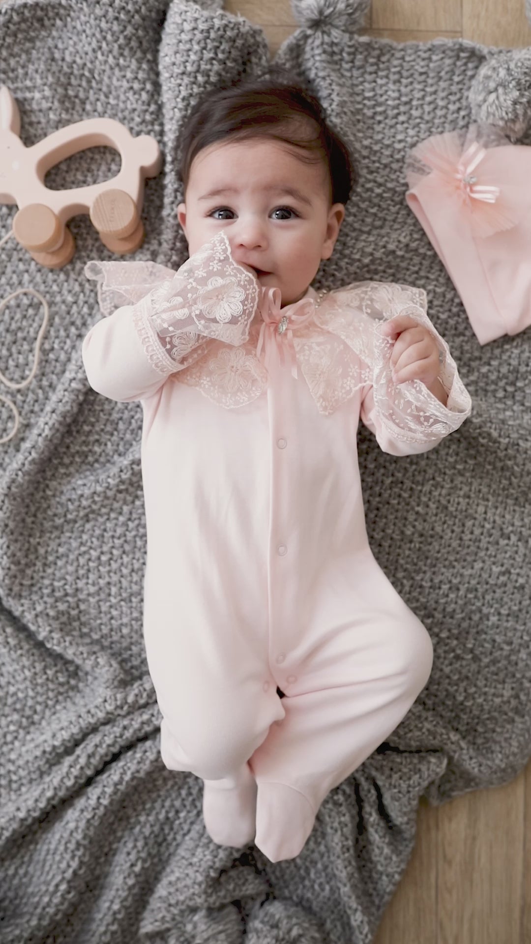 Description A regal footie one-piece for your dearest darling. Floral lace trimming, an embellished collar, and a matching bonnet deliver girlish elegance. While the incredibly soft cotton keeps your angel cozy all day long.